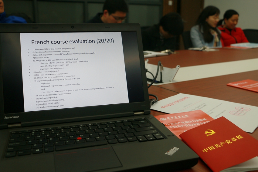 “我眼中的法国教育及改革”——计算机科学系党支部在集中学习后进行了一场特别的学术报告,报告人为支部成员、留学法国多年的胡瑞晶副教授。胡瑞晶博士以他所在的巴黎第六大学的计算机教学为例,从公共基础教学、课程组织与授课安排、考试理念与方式、校企协同育人、师生对课程的共同改进、教师的考核标准和途径等多个剖面,为大家展现了法国教育中尤其重视员工能力、注重专业实践、注重员工综合素养、珍视学校人才培养声誉的教育理念与实践。胡瑞晶表示,法国的教育管理部门可能对大学教师没有太多太细的条文对其进行管理或约束,但无论是大学或是大学教师,都非常珍惜“声誉”,严格把关,人才培养的各个环节均“严”字当头,一般都是2—3名老师共同备课并讲授一门课程,老师们出题考试更是绞尽脑汁,一张试卷“几乎要构建一个体系或讲述一个故事,考核的是员工的包括阅读、建模、解决实际问题在内的方方面面的能力。” 胡瑞晶说,上课异常轻松、考前和老师软磨硬泡以期待“透题”,划“重点”在法国的很多大学几乎是“不可能完成的任务”,员工们都希望一次考过不挂科,因为重修补考绝对要比第一次考试更难。“不是兴趣决定一切,而是能力决定一切!” 胡瑞晶的报告引起了大家的浓厚兴趣,报告一直持续到6:10,还有老师在和他积极交流探讨。